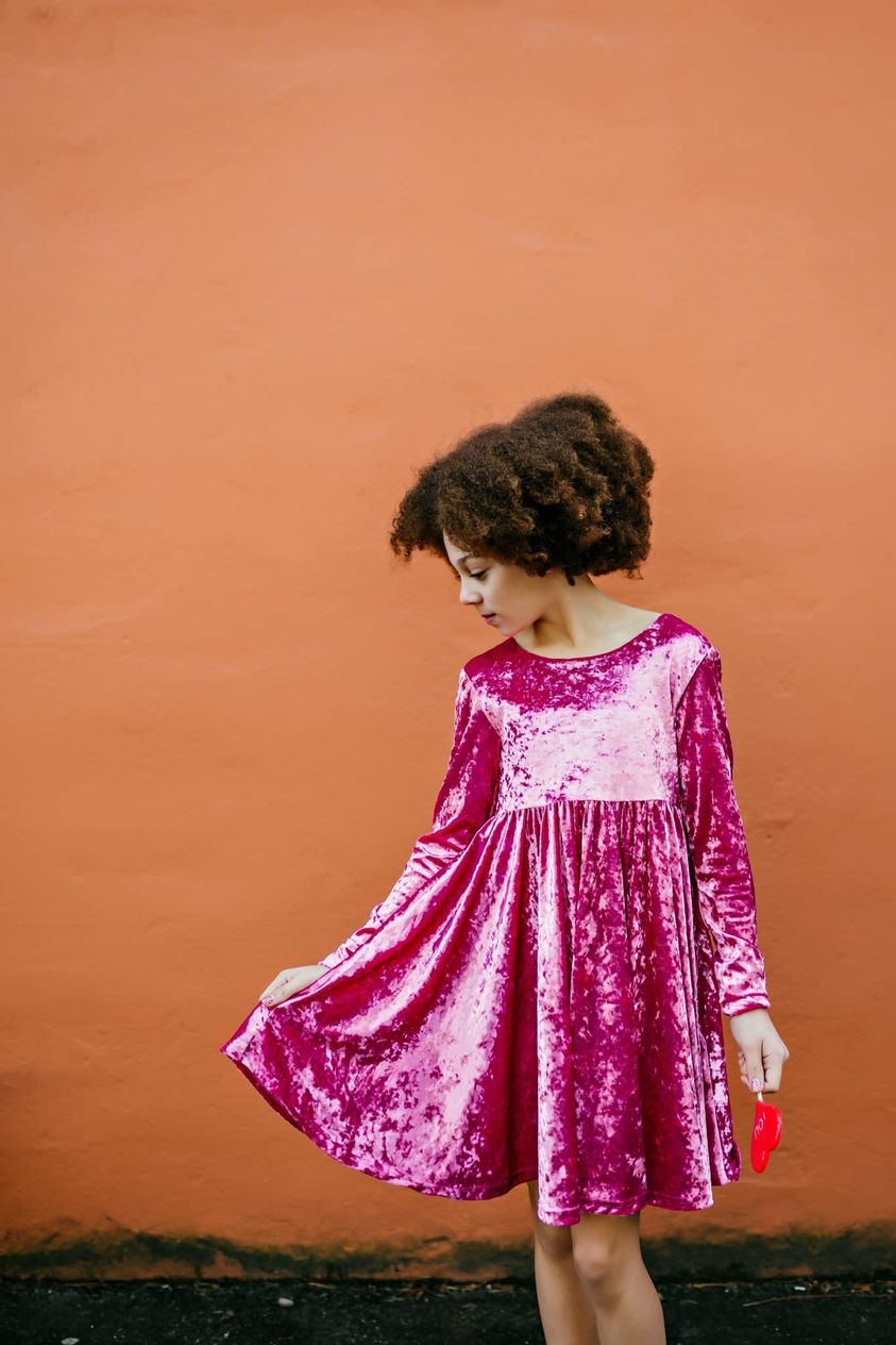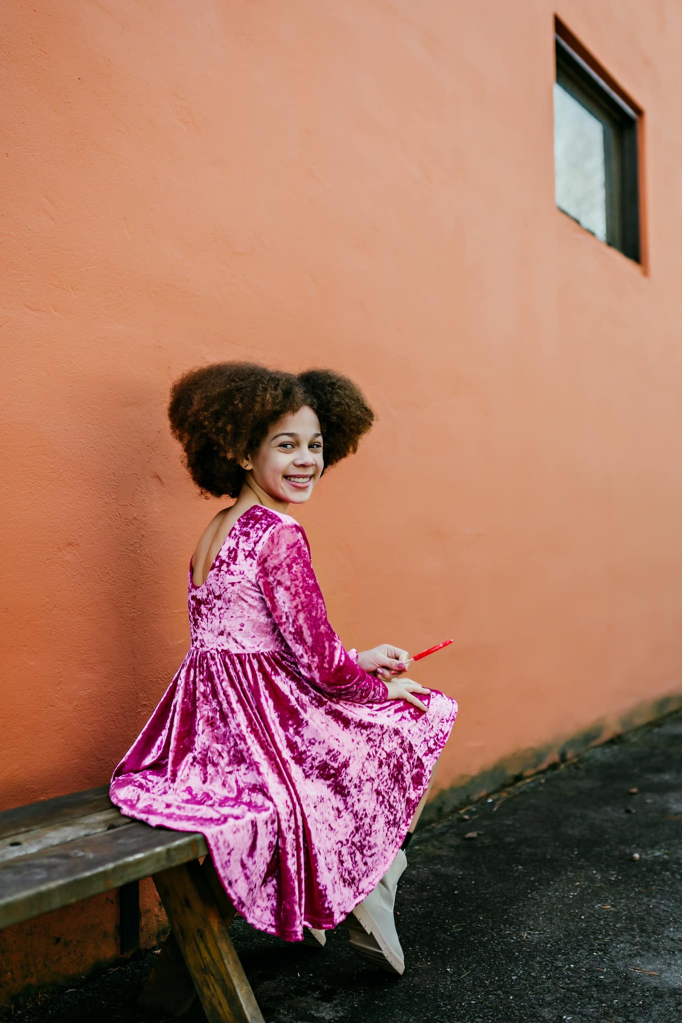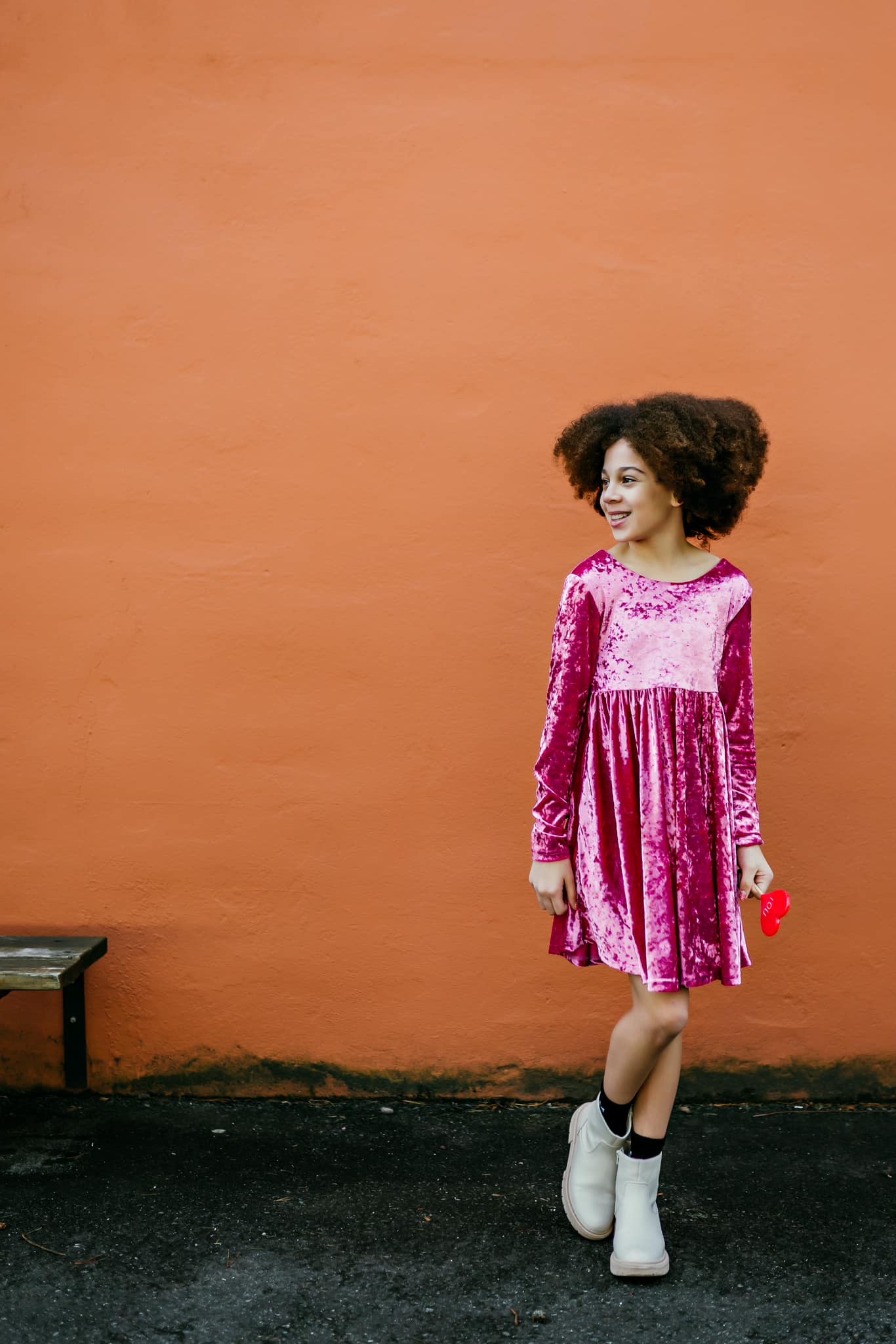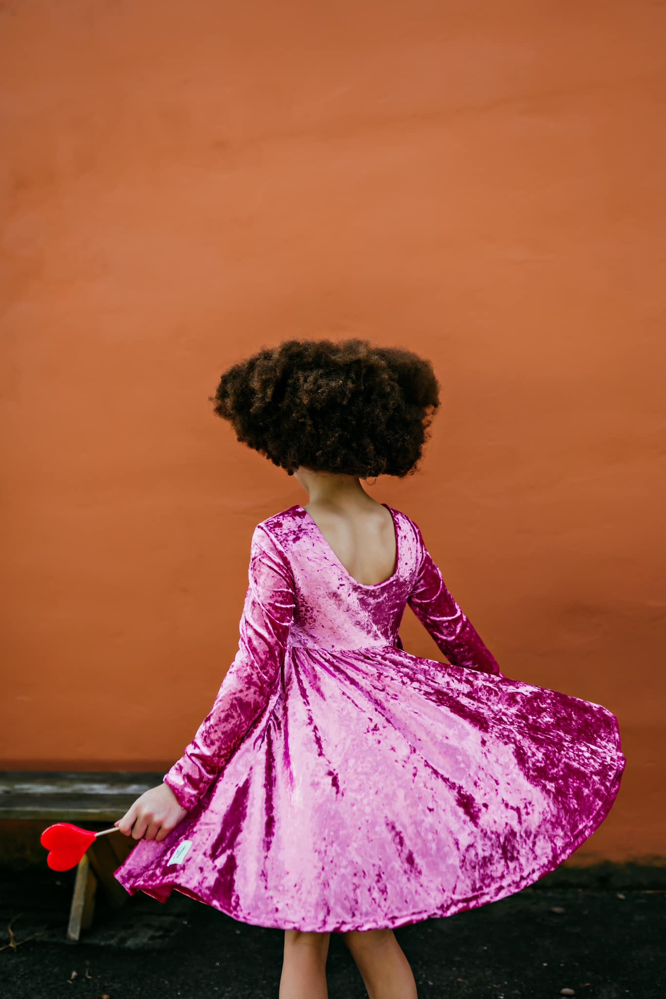 Mamas, this super luxe dress is perfect for your girl! It has lightweight crushed velvet fabric, with a soft lining at the top for extra coverage. Plus, its scoop back, pockets, long sleeves, and full twirl skirt make it oh-so-chic! It also happens to be the prettiest shade of pink. <3