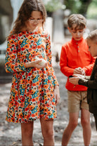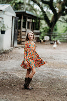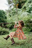 Mamas, this colorful and fun dress is perfect for your girl! It has super soft fall-colored (orange, yellow, blush, and teal) floral print fabric with double lining at the top for extra coverage. Plus, its scoop back, pockets, long sleeves, and full twirl skirt make it oh-so-chic! It also happens to look especially great with the boys pieces from our Harvest Garden collection. <3