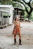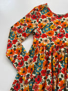 Mamas, this colorful and fun dress is perfect for your girl! It has super soft fall-colored (orange, yellow, blush, and teal) floral print fabric with double lining at the top for extra coverage. Plus, its scoop back, pockets, long sleeves, and full twirl skirt make it oh-so-chic! It also happens to look especially great with the boys pieces from our Harvest Garden collection. <3