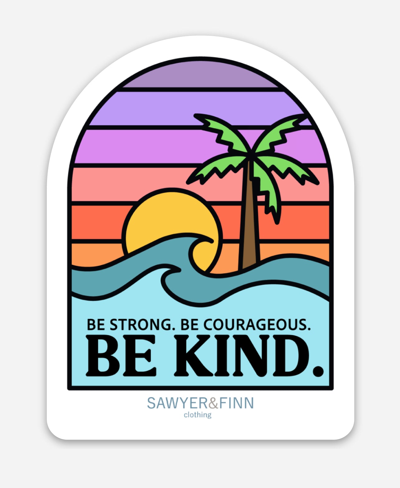 We turned our amazing summer motto tees into a sticker! Our sticker is bright, colorful, and spreads the Sawyer & Finn  "Be Strong. Be Courageous. Be KIND."  motto in style. Great for water bottles, lunch boxes, laptops, and MORE!