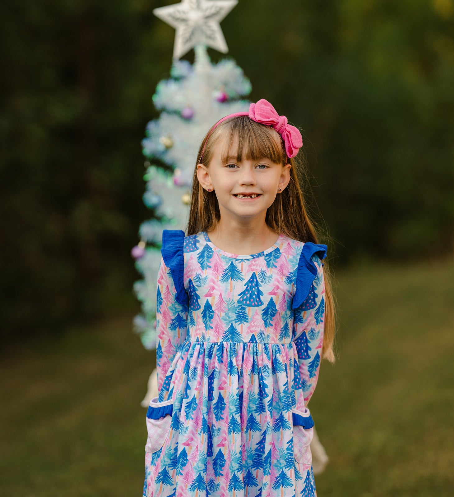 A dreamy little pink and blue forest makes a sweet (and SOFT!) dress your daughter is sure to LOVE. Printed trees on bodice and skirt, fun plaid print pockets...it's the perfect Winter dress! The colors coordinate so well with our Everyday Longsleeve Tee, Ribbed Romper, and Varsity Hoodie from the collection, making for the best sibling matches. Sizes 18m - 7 only available with flutter sleeves, sizes 8, 9/10, 11/12, and 13/14 are available with OR without flutters.